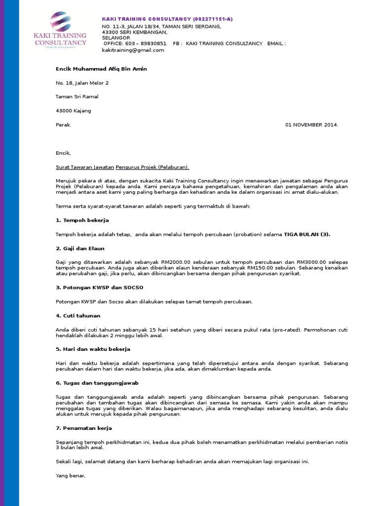 Name of employer or firm nama majikan atau firma occupation sector sektor pekerjaan occupation pekerjaan length of service tempoh perkhidmatan years tahun terms of employment terma pekerjaan. Surat rasmi tawaran kerja kontrak persoalan s. Contoh surat tawaran kerja daripada majikan contoh surat.